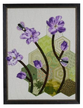 A burst of lilacs against a hexagonal background, inspires thoughts of springtime. Flowers are three-dimensional, and the butterflies are bead-embroidered 3D elements.