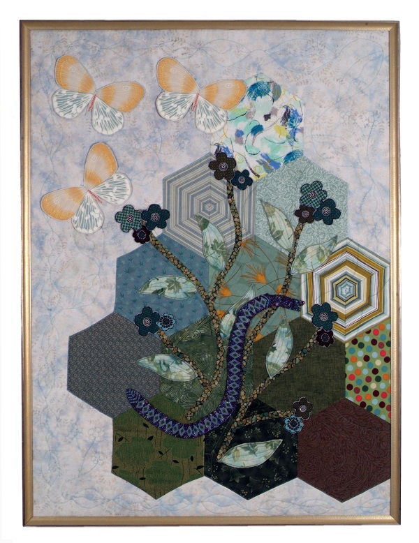 Elegant curving sprays of flowers rest on the first green of the season, as winter gives way to spring. Original design, with a subtle bead-woven snake, three-dimensional beaded flowers, and semi-detached leaves.
