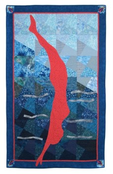 Shifting ocean hues behind the silhouette of a swimmer, who dives into the depths with abandon.